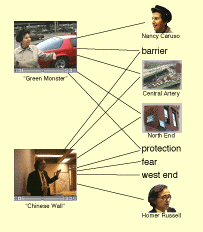 Figure 4 shows two video clips in the left column and their associated descriptors in the right. The first is of North End resident Nancy Caruso describing how the Central Artery currently serves as a "green monster," dividing the North End from the rest of the city and protecting the community's residents from outsiders. In the second clip, urban planner Homer Russell expresses a similar idea about the Artery functioning as "a sort of Chinese Wall" or barrier. In addition, he notes how the North End community was justifiably frightened based on the experience of the West End, a community once like the North End that was leveled and replaced by highrise buildings in the 1960s.