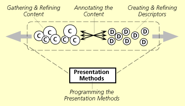 The second and final step is to describe the content using the established set of descriptors. The knowledge representation used in ConText is a simple bidirectional mapping between units of content and units of description. That is, the author associates a set of relevant descriptors for each piece of content added to the system. As the author connects each piece of content with sets of descriptors, they also define a mapping from descriptors to sets of content. Thus, for each descriptor, we know the set of content units that it describes. Note that relationships between content and descriptors are unqualified; the links are not weighted. Thus the core representation is equivalent to a simple keyword system. Descriptor weights, or prominences, are a function of playout during the ConText browsing session as described in the following secion on Presentation Methods.