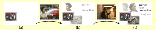 Figure 8 shows a progression of three story contexts. In context (a), a picture representing the North End is the sole prominent descriptor. Recall the "Green Monster" and "Chinese Wall" clips and their associated descriptors shown in figure 4. Given this context and assuming neither clip has been seen by the viewer, both would have a non-zero score because of their shared connection to the "North End" descriptor. In accordance with the "progression of detail" methodology however, "Green Monster," with its five associated descriptors, has a higher score than "Chinese Wall" with its seven descriptors. Context (b) shows the effect of the "Green Monster" clip's playout, as the character "Nancy Caruso," the location "Central Artery," and the themes "Barrier" and "Protection" have become more prominent. Given this new context, the "Chinese Wall" clip has an even higher score than before and thus becomes the next clip selected for playout. Context (c) shows the resulting context after "Chinese Wall" plays out, the repeated themes of "Protection" and "Barrier," as well as the locations "Central Artery" and "North End" have become quite prominent. In addition, the descriptors for the theme "Fear," the location "West End," and the character "Homer Russell" have each become more prominent while the character "Nancy Caruso" has begun to recede.