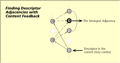 By mirroring the structure and mechanism of description feedback described above, the system is capable of producing an analogous process of "content feedback" to explore possible movements within the space of descriptors. Given the set of descriptors with adjacencies to the those prominent in the current story context, the system can "increase the pace" of the story by making those adjacent descriptors more prominent than the current ones. In order to prevent immediate movement back towards the previous story context, a structure analogous to the "already shown?" tag used with units of content could be used with descriptors, capturing whether the descriptor had recently been invoked by the pacing mechanism. Figure 7 shows an overview of this process.