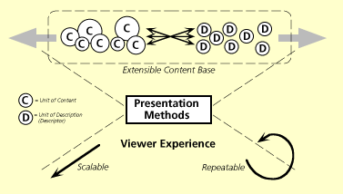 In the world of digital media systems, the materials for an evolving story may be stored immediately, on collection, in a content repository. The materials grow as the story evolves. For this reason the storage and descriptive architecture must be extensible. We must be able to add new materials easily without noticeably impairing retrieval. In addition, we must be able to retrieve materials without the viewer knowing explicitly what is there. In the case of the "Evolving Documentary," the media materials and the description space in which they are mapped must be scalable, and the experience afforded the viewer must be interesting enough to encourage repeated exploration. Figure 2 shows an overview of this process.