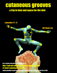 Cutaneous Grooves was a showcase of the idea of "tactile composition." It was essentially a concert for the skin; a dance that you feel instead of see. A space was set up for ten people with an individual vibrotactile stimulation device for each audience member. During the show the audience would experience choreographed vibrations against the surface of the body. Most of the pieces were accompanied by music while some were exclusively tactile. The following video footage illustrates the space and several audience members suiting up at the beginning of the concert. Stay tuned for a more comprehensive video of the show.