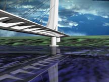 The following was a project for 4.203 Geometric Modeling, a CAD class here at MIT's Architecture Department. Based on the Ecole des Beaux Artes practice of the Analytique, an artistic study of a building and concepts related to its construction, this piece depicts Santiago Calatrava's Alamillo Bridge, in Seville. The bridge was constructed for the World's Fair, and was completed in 1992. Also here are 2 stills from a 1.5 minute computer animation of the bridge. I modelled the structure in AutoCAD, then rendered in 3-D Studio, dumped to VHS and added music. You can get the Cinepak'd Quicktime file below, plus FLC files, with no audio.